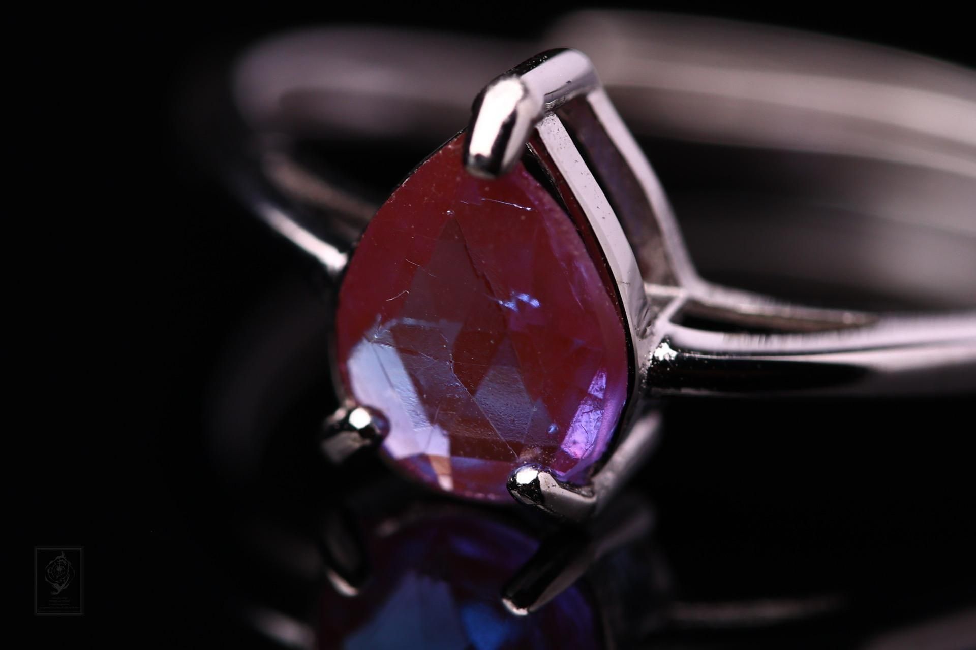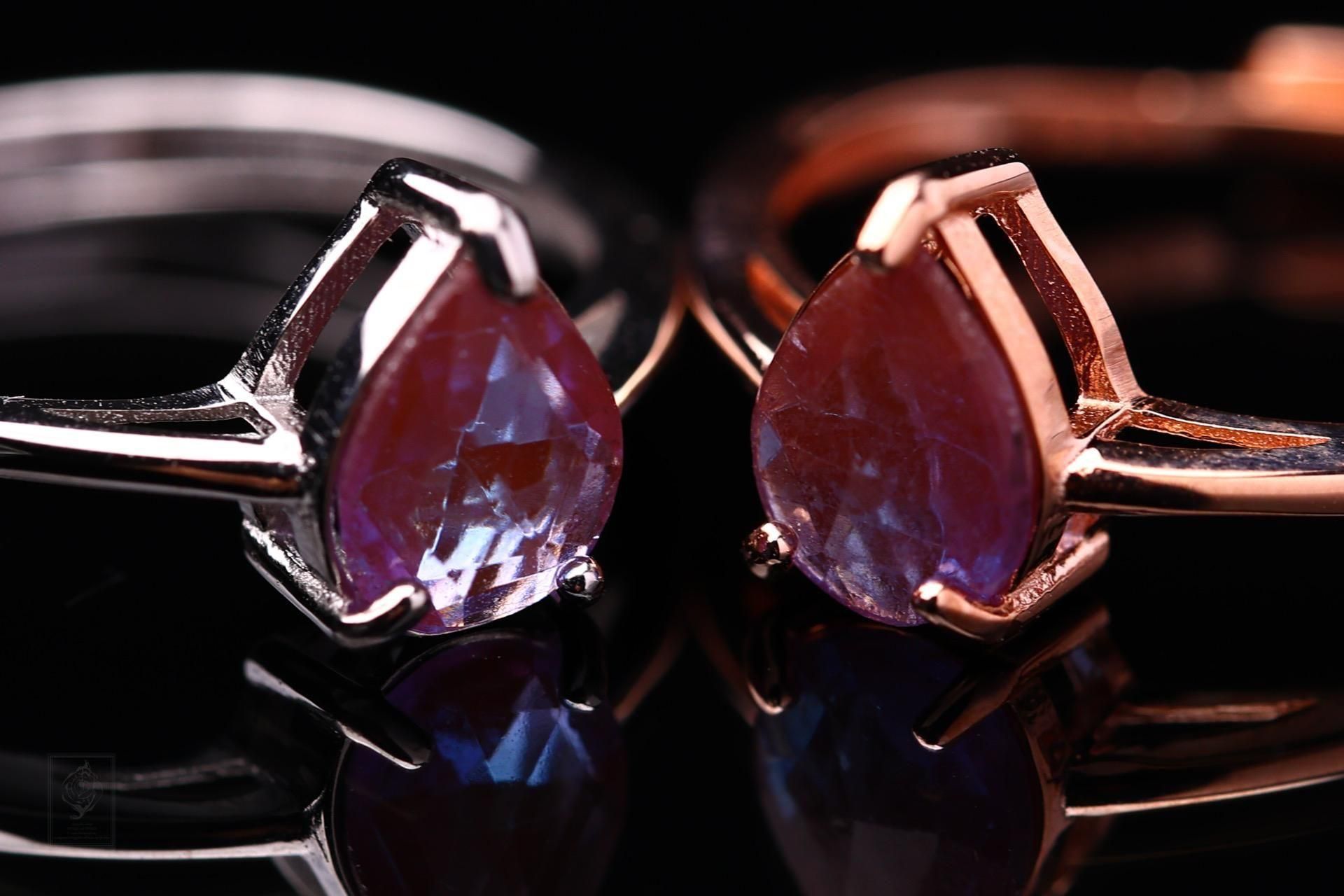 このルースは強い光を浴びたときのカラーチェンジが顕著で、白熱灯ライトを照射するとピンクが現れます。またバックフォイルがないので、明るい方向にかざしてみるとブルーとパープルの美しいグラデーションを楽しむことができます。