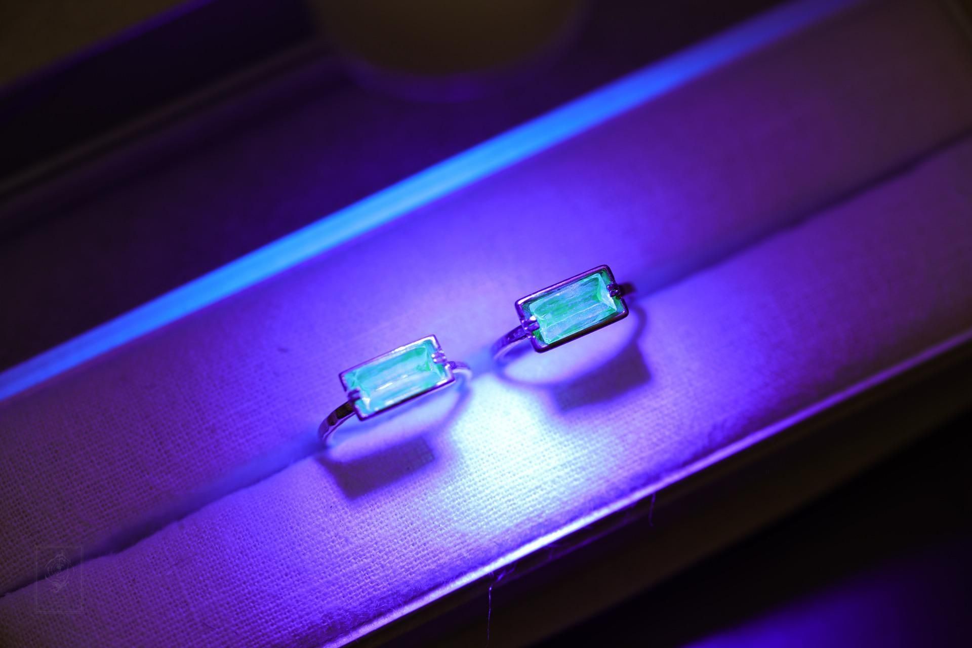UVライトを照射するとネオングリーン蛍光し、静かな輝きの中に、確かな個性を感じる一点です。